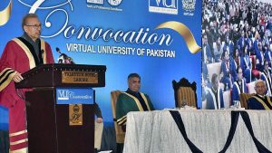 صدرمملکت ڈاکٹر عارف علوی نے تمام سٹیک ہولڈرز پر زور دیا ہے کہ وہ بچوں کے سکولوں میں داخلے کو یقینی بنائیں اور تمام ایف ایس سی کے کوالیفائیڈ طلبا کو اعلیٰ تعلیمی اداروں میں بھیجا جائے،ملک میں پرائمری کے بچوں کے سکولوں میں اندراج کی شرح صرف 68فیصد ہے جبکہ ہمسایہ ملک میں یہ شرح 98فیصد جبکہ ہائر ایجوکیشن میں داخلوں کی شرح صرف 9فیصد ہے اور اگر اس کا موازنہ دیگر علاقائی ممالک سے کیا جائے تو وہاں اس کی شرح 60فیصد ہے جو کہ ملک میں معاشی اور واقتصادی ترقی کی رفتار کے حصول اور معیاری انسانی وسائل کی ضروریات کے لیے انتہائی نا کافی ہے ۔انہوں نے ان خیالات کا اظہار جمعرات کو ورچوئل یونیورسٹی آف پاکستان کے کانووکیشن کی تقریب سے خطاب کرتے ہوئے کیا۔تقریب میں یونیورسٹی کے فیکلٹی ،طلبہ اور انکے والدین نے شرکت کی۔ تقریب سے خطاب کرتے ہوئے صدر مملکت نے کہا کہ سکول جانے والی عمر کے تمام بچوں کو سکولوں میں جانا چاہئے اور کوئی بچہ بھی تعلیم سے محروم نہیں رہنا چاہئے جوکہ ملک کی ترقی کیلئے لازم ہے ۔انہوں نے کہا کہ جنوب ایشائی خطے کے ممالک سے اگر موازنہ کیا جائے تو پاکستان میں پرائمری سطح پر سکولوں میں بچوں کا اندراج صرف 68فیصد ہے جبکہ ہمسایہ ملک میں یہ شرح 98فیصد ہے۔انہوں نے کہا کہ پرائمری سطح پر سکولوں میں بچوں کے اندراج کی اتنی کم شرح خطرے کی علامت ہے اور پوری قوم کیلئے لمحہ فکریہ ہے ۔صدرمملکت نے کہا کہ یونیورسٹیاں طلبہ کو داخلے نہ دیکر عام طور پر فخر محسوس کرتی ہیں جبکہ ہزاروں طلبا کی یہ خواہش ہوتی ہے کہ وہ اعلیٰ تعلم حاصل کریں ۔انہوں نے کہا کہ یہ عمل ٹھیک نہیں اور اس کی حوصلہ شکنی کرنے کی اشد ضرورت ہے انہوں نے ملک کے سرکاری اور الحاق شدہ اعلیٰ تعلیمی اداروں پر زور دیا کہ وہ تمام طلبا جو اپنی صلاحیتوں اور استعداد کار کو بڑھانے کی کوشش کرتے ہیں ان کے مذکورہ تعلیمی اداروں میں 100فیصد داخلوں کو یقینی بنانا چاہئے تاکہ اعلیٰ تعلیم سے مزین گریجویٹس آن لائن اعلیٰ تعلیم حاصل کرکے ملکی ترقی میں اپنا کردار ادا کرسکیں ۔