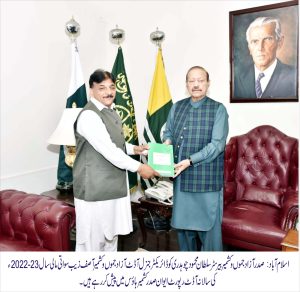 اسلام آباد(بی بی سی)صدر آزادجموں و کشمیر بیرسٹر سلطان محمود چوہدری سے ڈائریکٹر جنرل آڈٹ آزاد جموں وکشمیر آصف زیب سواتی کی ایوان صدر کشمیر ہاؤس اسلام آباد میں ملاقات۔ اس موقع پر ڈائریکٹر جنرل آڈٹ آزاد جموں وکشمیر آصف زیب سواتی نے مالی سال 2022-23ء کی سالانہ آڈٹ رپورٹ صدر ریاست آزاد جموں وکشمیر بیرسٹر سلطان محمود چوہدری کو پیش کی۔ یہ آڈٹ رپورٹ آزادجموں وکشمیر کے عبوری آئین 1974ء کے آرٹیکل 50اے کے تحت صدر آزاد کشمیر کو پیش کی گئی۔ اس موقع پر ڈائریکٹرجنرل آڈٹ آزاد جموں وکشمیر آصف زیب سواتی نے صدر ریاست آزاد جموں وکشمیر بیرسٹر سلطان محمود چوہدری کو آڈٹ رپورٹ 2022-23ء کے چیدہ چیدہ نکات اور محکمہ آڈٹ کی کارکردگی پر بریفنگ دی۔ اس موقع پر صدر ریاست آزاد جموں وکشمیر بیرسٹر سلطان محمود چوہدری نے ہدایت کی کہ آڈٹ ایک اہم کام ہے اور اس میں مزید بہتری لائی جائے اور پوری محنت کے ساتھ کام کریں جبکہ محکمہ میں سٹاف کی کمی کو پورا کیا جائے تاکہ محکمہ کی کارکردگی بہترکرنے میں مدد ملے اور ادارہ اپنا کام بہتر انداز میں سرانجام دے سکے۔