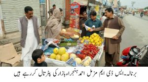 برنالہ(پی آئی ڈی)اسٹنٹ کمشنر برنالہ مزمل حسین ہنجراءنے،نائب تحصیلدار راجہ عارف کے ہمراہ برنالہ بازار کی بازارپٹرتال کی، فروٹ سبزی معیاراور قیمتوں کاجائزہ لیا۔ ریٹ لسٹ آویزاں نہ کرنے،گراں فروشی کرنے والے متعدد دکانداروں کوجرمانہ اور وارننگ دی گئی،اے سی نے کہاکہ ریٹ لسٹ کے مطابق سامان فروخت کریں ۔خصوصی طور پر پکوڑے سموسے 2 بجے سے پہلے نہ تیار کریں، ٹائم کی پابندی اورصفائی ستھرائی رکھیں خفیہ ٹیمیں تشکیل دی گئی ہیں جو ہوٹل اور فاسٹ فوڈ سمیت دیگر بازار کی رپورٹ مرتب کررہی ہیں۔