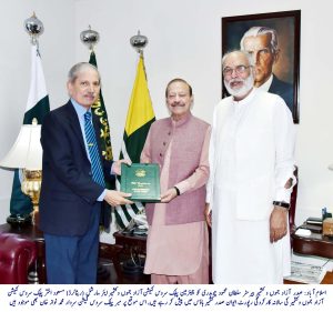 اسلام آباد(بی بی سی)صدر ریاست آزاد جموں وکشمیر بیرسٹر سلطان محمود چوہدری کو چیئرمین پبلک سروس کمیشن آزاد جموں و کشمیر ایئر مارشل (ریٹائر)مسعود اختر نے پبلک سروس کمیشن آزاد جموں و کشمیر کی سالانہ کارکردگی رپورٹ آج یہاں ایوان صدر کشمیر ہاؤس اسلام آباد میں پیش کی۔ اس موقع پر چیئرمین پبلک سروس کمیشن آزاد جموں و کشمیر ایئر مارشل (ریٹائر)مسعود اختر نے صدر آزاد جموں وکشمیر بیرسٹر سلطان محمود چوہدری کو پبلک سروس کمیشن کی گزشتہ سال کی کارکردگی، اغراض و مقاصد اور درپیش مسائل سمیت دیگر امور پر تفصیلی بریفنگ دی۔ اس موقع پر ممبر پبلک سروس کمیشن سردار محمد نواز خان بھی موجود تھے۔