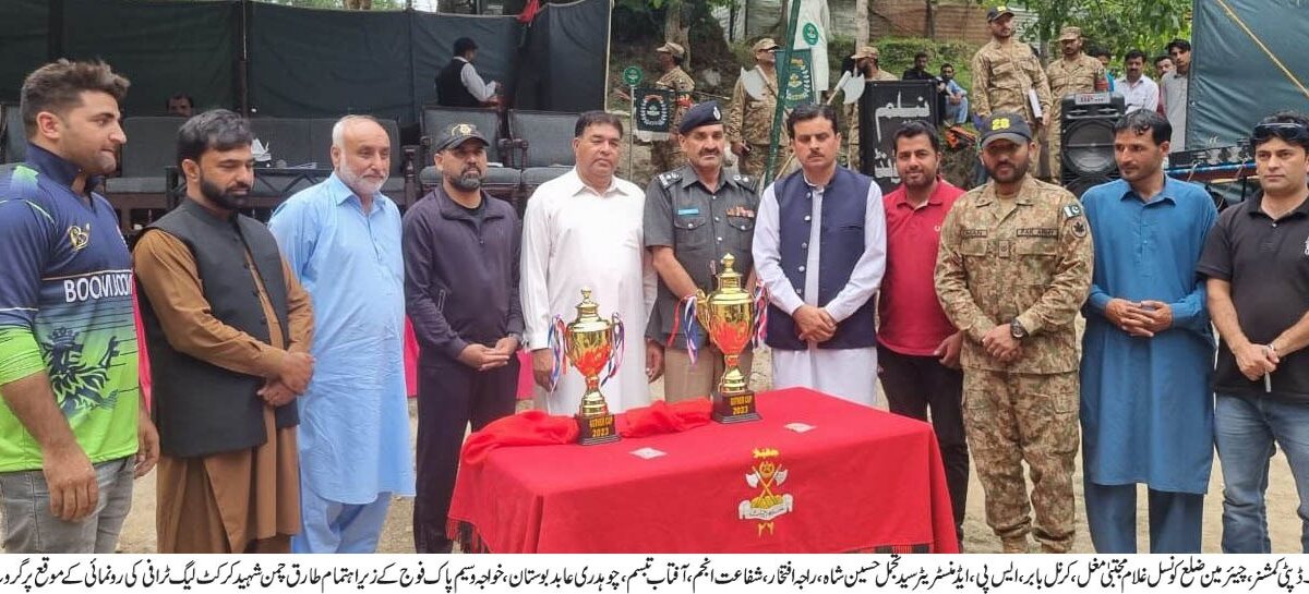نیلم(ضیاء سرور)پاک آرمی کے زیراہتمام طارق چمن شہید کرکٹ لیگ ٹرافی کی رنگارنگ رونمائی تقریب کاانعقاد۔ٹرافی کی رونمائی تقریب گزشتہ روز آرسی گراؤنڈ شاہکوٹ میں منعقد ہوئی۔گتھر کپ2023کی گرینڈ اوپننگ سرمنی کرنل بابر، ڈپٹی کمشنر، ایس پی،چیئرمین ضلع کونسل غلام مجتبیٰ مغل،ایڈمنسٹریٹر بلدیہ آٹھمقام سید تجمل حسین شاہ،کونسلر راجہ افتخار خان، کونسلر شفاعت انجم، آفتاب تبسم، چوہدری عابد بوستان، خواجہ وسیم نے ٹرافی کی رونمائی کی۔نیلم کی 22 کرکٹ ٹیموں کے درمیان ٹوون ڈے میچوں کی سریز کاپہلا میچ بروز جمعرات 11ہزارفٹ بلندی پر گتھر شاہین میں کھیلاجائیگا۔تفصیلات کے مطابق کمانڈنگ آفیسر کرنل سرفراز خان کی ہدایت پر نیلم کے پرفضاء سٹیڈیم آرسی شاہکوٹ میں ٹرافی کی رونمائی تقریب منعقد ہوئی۔ جس میں ضلعی انتظامیہ، سول سوسائٹی سمیت کھلاڑیوں کی 22ٹیموں نے بھرپور شرکت کی۔تقریب کے مہمان خصوصی کرنل بابر اور صدارت ڈپٹی کمشنر نے کی۔جمعرات سے گتھر شاہین پر کرکٹ میچوں کاآغاز کردیاجائے گا۔ ڈپٹی کمشنر،چیئرمین ضلع کونسل غلام مجتبیٰ مغل،ایڈمنسٹریٹر بلدیہ سید تجمل حسین شاہ،کونسلر راجہ افتخار خان،آفتاب تبسم، کونسلر شفاعت انجم، ملک شرافت نے خطاب کرتے ہوئے کہاہے کہ ہسپتالوں کو ویران کرنے کیلئے کھیلوں کے میدانوں کو آباد کرنا ہوگا۔ نوجوان نسل کو کھیلوں کی سرگرمیوں میں مشغول کرنے پر افواج پاکستان کو خراج تحسین پیش کرتے ہیں۔کھیلوں کے میدان آباد رہنے سے صحت مندسرگرمیاں پروان چڑھائیں گئے۔نوجوان نسل جب تعلیم اور کاروبار کے علاوہ وقت کھیلوں میں صرف کریں گئے تو صحت مند زندگی کیساتھ منشیات جیسی لعنت سے محفوظ رہیں گئے۔مقررین نے ضلع بھر میں کھیلوں کی سرگرمیوں کو فروغ دینے پرزور دیاہے۔آٹھمقام،شاردہ، کیل، گریس اور جورا کے کرکٹ گراؤنڈز کو فعال کرنے کیلئے تجاویز پیش کی گئیں۔تقریب میں کرکٹ لیگ کی مینجمنٹ کمیٹی اور چیئرمین کرکٹ لیگ خواجہ وسیم کی کاوشوں کوسراہاگیاہے۔ڈپٹی کمشنر، چیئرمین ضلع کونسل غلام مجتبیٰ مغل،ایڈمنسٹریٹر بلدیہ سید تجمل حسین شاہ، کونسلر راجہ افتخار نے کھلاڑیوں کیلئے کیش پرائز کابھی اعلان کیا۔ڈپٹی کمشنر اورنمائندہ محکمہ سپورٹس چوہدری عابد بوستان نے ادارہ کی جانب سے کھیلوں کے فروغ میں ہر ممکن تعاون کی یقین دہانی کروائی ہے۔کرکٹ سٹیڈیم کیلئے چیئرمین ضلع کونسل غلام مجتبیٰ مغل، کونسلر راجہ افتخار،صدر پرائیویٹ سکولز ایسوسی ایشن آفتاب تبسم نے جامع تجاویز بھی پیش کیں۔تقریب میں کونسلر راجہ کامدار، وائس چیئرمین سالخلہ حاجی جیلانی، زکاؤالرحمن سمیت سول سوسائٹی، انجمن تاجران، انتظامیہ اور فوجی حکام نے بھرپور شرکت کی۔یاد رہے کہ بروز جمعرات 6جولائی 2023کو 22ٹیمیں کرکٹ میچوں کیلئے نیلم کی بلند چوٹی گتھر شاہین پہنچیں گی جہاں ٹوون ڈے کرکٹ میچ کھیلے جائیں گئے۔