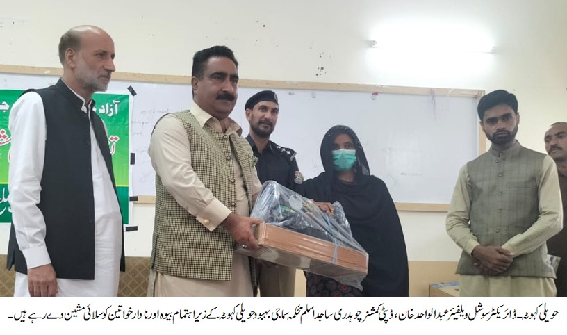 حویلی کہوٹہ (بی بی سی)سماجی بہبود ضلع حویلی کے زیر انتظام بیوہ اور نادار خواتین کو سلائی مشین، اور مستحق معذور افراد کو وہیل چیئرز کی فراہمی کے سلسلہ میں ایک تقریب کا انعقاد گورنمنٹ بوائز ڈگری کالج کہوٹہ کے ہال میں منعقد ہوئی۔ تقریب سے خطاب کرتے ہوئے ڈائریکٹر سوشل ویلفیئر عبدالواحد خان نے کہا کہ محکمہ سوشل ویلفیئر آزاد کشمیر میں مستحق افراد کی فلاح و بہبود کے کیلئے مثالی کردار ادا کر رہا ہے،مستحق افراد کی امداد کے لیے لوکل کمیونٹی اور مخیر حضرات اپنا کردار ادا کریں، لوکل کمیونٹیء کے تعاون کی اشد ضرورت ہے تاکہ معاشرے کے ہر نادار لوگوں کی خدمت کی جا سکے،اس موقع پر ڈائریکٹر سوشل ویلفیئر نے ضلع حویلی کہوٹہ کے پسماندہ علاقہ یونین کونسل بھیڈی میں سلائی مشینیں اوروہیل چیئرز کی فراہمی کا اعلان بھی کیا۔ تقریب سے خطاب کرتے ہوئے ڈپٹی کمشنر ضلع حویلی چوہدری ساجد اسلم نے کہا کہ محکمہ سوشل ویلفیئر ضلع حویلی اپنے امور بطریق احسن سر انجام دیتے ہوئے معاشرے کی بہتری کیلئے کردار ادا کر رہا ہے، اس موقع پر تقریب میں موجود 17 خواتین میں سلائی مشین جبکہ 10 معذور افراد میں وہیل چیئرز تقسیم کی گئی۔