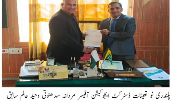 پلندری(بی بی سی)نو تعینات ڈسٹرکٹ ایجوکیشن آفیسر مردانہ سکولز سدھنوتی وحید عالم نے اپنے عہدے کا چارج سنبھال کر کام شروع کر دیا ۔ سابق ڈسٹرکٹ ایجوکیشن آفیسر سردار ارشد حسین نے عہدے کا چارج وحید عالم کے حوالے کیا۔…