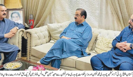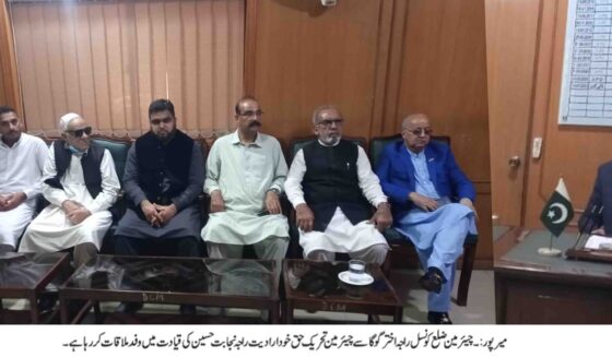 میرپور (بی بی سی)چیئرمین تحریک حق خوداردادیت انٹرنیشنل راجہ نجابت حسین کی وفد کے ہمراہ چیئرمین ضلع کونسل میرپور راجا نوید اختر گوگا کے ساتھ ان کے دفتر میں ملاقات۔دونوں راہنماؤں کی فلسطین اور کشمیر میں جاری انسانی حقوق کی…