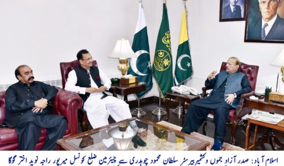 صدر آزاد جموں وکشمیربیرسٹر سلطان محمود چوہدری سے چیئرمین ضلع کونسل میرپور راجہ نوید اختر گوگا اور صدارتی کورآرڈینیٹر چوہدری امجد محمود کی ایوان صدر کشمیر ہاؤس میں تفصیلی ملاقات