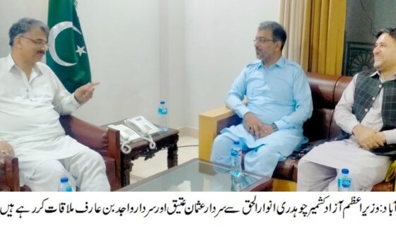 وزیراعظم آزادحکومت ریاست جموں و کشمیر چوہدری انوار الحق سے چیئرمین مسلم کانفرنس یوتھ ونگ سردار عثمان عتیق اور مسلم کانفرنس یوتھ ونگ کے صدر سردار واجد بن عارف نے پی ایم ہاؤس میں ملاقات کی