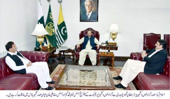اسلام آباد(بی بی سی)صدر آزاد جموں وکشمیر بیرسٹر سلطان محمود چوہدری سے جسٹس خواجہ محمد نسیم سینئر جج سپریم کورٹ آف آزاد جموں وکشمیر اور جسٹس رضا علی خان جج سپریم کورٹ آف آزاد جموں وکشمیر کی ایوان صدر کشمیر…