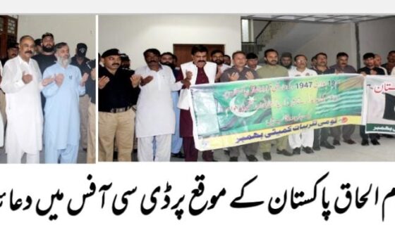 بھمبر(بی بی سی)یوم الحاق پاکستان کے موقع پرضلعی ہیڈکوارٹربھمبرمیں مرکزی تقریب ایس ڈی ایم ہیڈکوارٹرمحمد عیص بیگ نےایس ایس پی راجہ محمد اکمل خان کی زیرصدارت ہوئی،دونوں افسران نے دیگر ضلعی افسران و شرکاء کے ہمراہ مرکزی ریلی کی قیادت…
